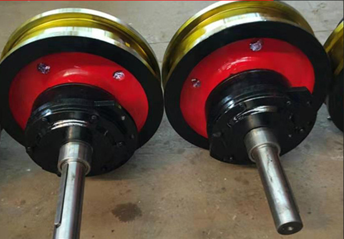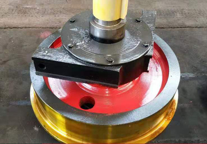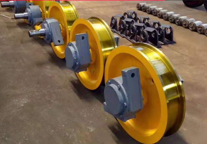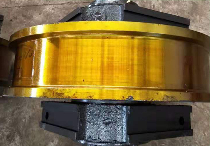 起重機(jī)大車車輪(行車車輪、天車車輪、行吊車輪)是比較容易損壞損耗的起重機(jī)部件。根據(jù)起重機(jī)行車的使用特點(diǎn),要求車輪踏面有較高的硬度,并且有一定的淬硬層深度和過(guò)渡層(深度>10mm,硬度HRC40 一48),以提高承載能力、耐磨性和抗接觸疲勞的性能。同時(shí),要求其基體組織要有良好的綜合力學(xué)性能和良好的組織狀態(tài),硬度應(yīng)達(dá)HBS187~229,使之具有高的韌性,提高抗沖擊性能和抗開裂性能。