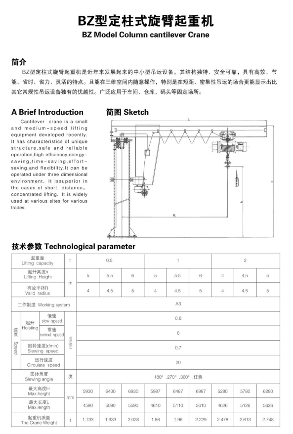 BZ型定柱式懸臂起重機(jī)由立柱裝置、回轉(zhuǎn)裝置、旋臂裝置及環(huán)鏈電動葫蘆等組成,主要包括立柱、起升機(jī)構(gòu)(環(huán)鏈電動葫蘆/鋼絲繩電動葫蘆)、回轉(zhuǎn)機(jī)構(gòu)、電氣系統(tǒng)。立柱下端固定于混泥土基礎(chǔ)上,旋臂回轉(zhuǎn),可根據(jù)用戶需求進(jìn)行回轉(zhuǎn)?;剞D(zhuǎn)部分分為手動回轉(zhuǎn)和電動回轉(zhuǎn)。