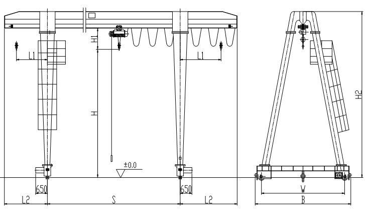 MH型單梁門式起重機(jī)是中小型可帶懸臂的簡(jiǎn)易門式起重機(jī)(俗稱:龍門吊、單梁門吊、龍門起重機(jī)等),電動(dòng)葫蘆采用CDI、MDI等形式,主梁是U型槽板與工字鋼焊接而成的組合梁,大車運(yùn)行機(jī)構(gòu)采用三合一驅(qū)動(dòng)裝置。